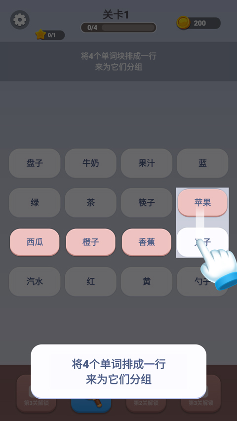 2、拖拽分组验答案:将词汇拖拽到相应分组区域完成分类,若正确,词汇会自动归组并点亮。