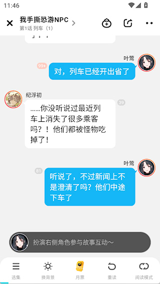 1、自动播放:进入阅读界面点击右上角按钮,选择自动播放模式,对话将自动展示无需频繁点屏。