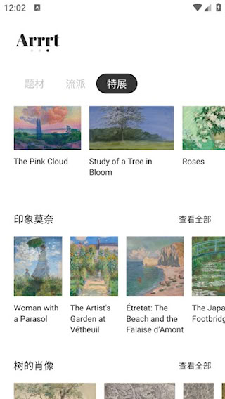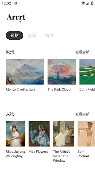 3、主界面提供多主题艺术内容推荐,涵盖肖像、风景、静物等不同题材分类