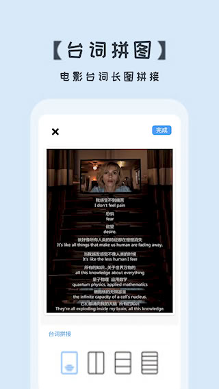 2、具备电影对白截图自动识别与合成能力,可将系列台词图像无缝连接为连贯长图,并直接保存至本地相册。