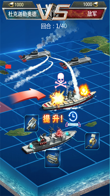 5、通过收集资源、组建舰队、升级科技,打造专属蓝海海军,纵横大洋扫除敌人。