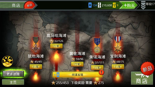 一共有5大战斗场景【犹他海滩】有15个关卡,【宝剑海滩】有25个关卡,【朱诺海滩】有37个关卡,【黄金海滩】有32个关卡【奥马哈海滩】有36个关卡,每个关卡如果完美过卡,除了可以得到一定的战争币、积分、手榴弹以外,还可以得到3个星星用来解锁锁定场景,5大场景中除了【犹他海滩】外,每一个战斗场景都需要一定的星星进行解锁,如果要解锁全部5大场景一共需要100个星星,【战役模式】是《火线指令:诺曼底》的基本关卡模式,主要用途就是来挣取战争币和积分,还有攻击坦克的手榴弹,如果等级提高还可以获得一定的金砖。