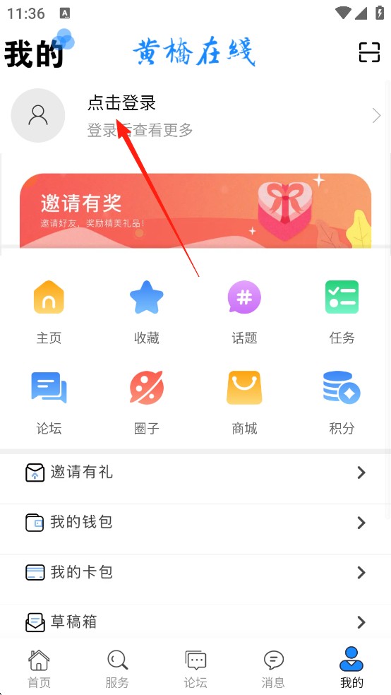1、打开黄桥在线 APP,点击底部菜单栏【我的】选项,需先完成注册并登录账号,未登录状态下无法查看招聘信息。