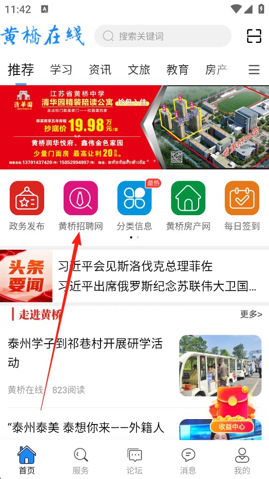 2、登录后返回 APP【首页】,在首页功能区找到并点击【黄桥招聘网】入口,即可浏览黄桥本地最新招聘信息。