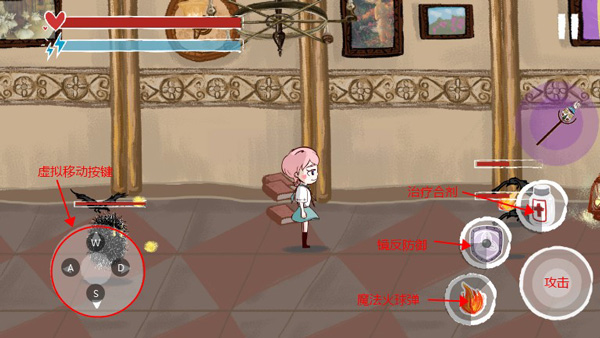 3、结合图文可先了解基本操作,后续能利用收获的水晶升级武器,提升基础攻击能力。