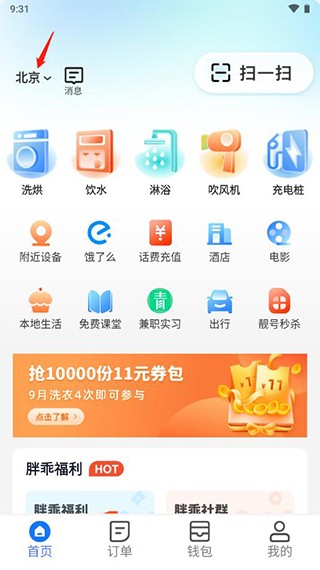 1、下载安装胖乖生活 APP 并打开,点击左上角定位按钮,授权后完成城市定位,确保精准匹配周边设备。