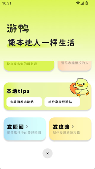 游鸭app是一款旅游服务应用,提供本地化旅游建议,融合社交分享与行程规划功能,整合本地人真实经验,涵盖从美食到文化体验的多元信息,搭配可视化地图辅助路线规划,支持个性化方案生成,匹配地陪向导深化旅行体验,感受省心有深度的出行过程。