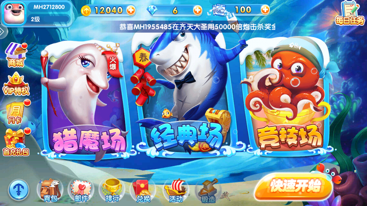 2、进入主界面后,直接点击 “快速开始” 按钮,无需复杂操作即可进入捕鱼场景。