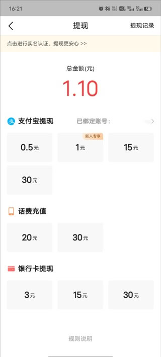 3、在提现方式中选择支付宝渠道,新注册成员可享受首笔提现特权。该笔提现额度设为1元,专用于体验完整流程。