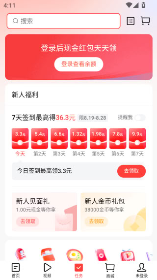 1、启动应用程序后进入主界面,选择底部导航栏中的任务入口。在任务中心页面定位并选择顶部的金额展示区域。