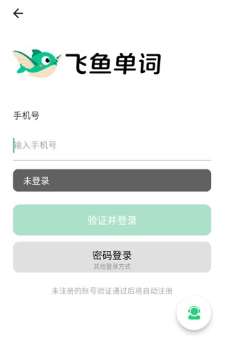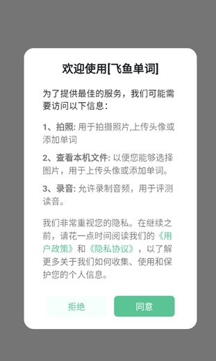 1、打开飞鱼单词 APP,首次使用需阅读并同意用户政策与隐私协议,完成基础权限确认后进入主界面。
