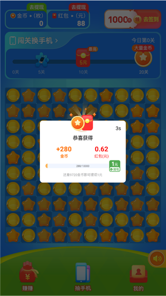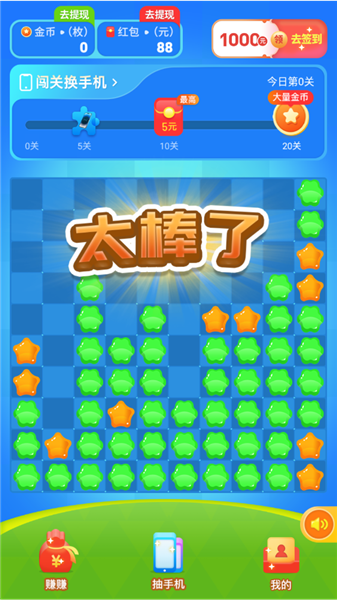 2、消除了所有的方块之后就可以过关领到红包了,红包大小是随机的。