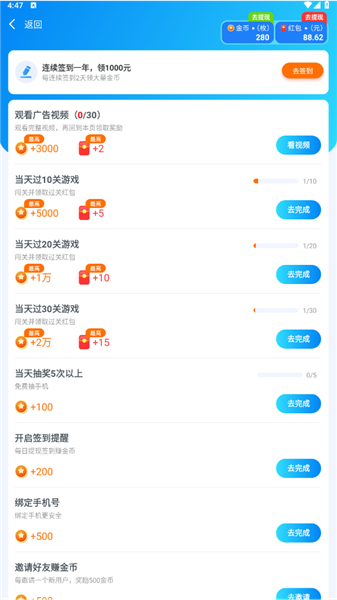 3、通过完成任务也是能够获得红包和金币奖励的。