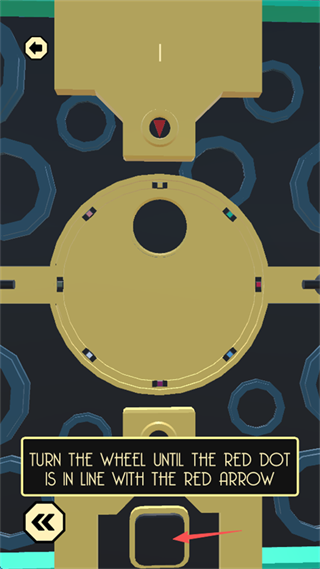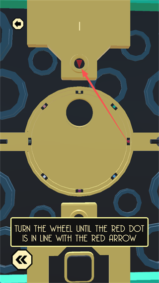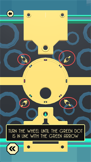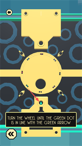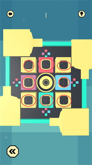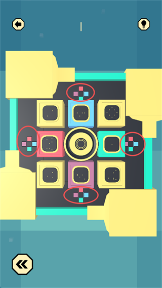 8、留意上下左右四个方向的 “颜色对应方向”,点击屏幕中间的 “黄圆形标识”,控制大型四色方块,使颜色方向与四周小颜色方向匹配。