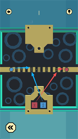7、观察屏幕下方 “红蓝方块的空洞形状”,在上方区域寻找对应的 “黄点标识”,再将对应颜色的 “红蓝圆形” 移动到 “黄点标识” 处。