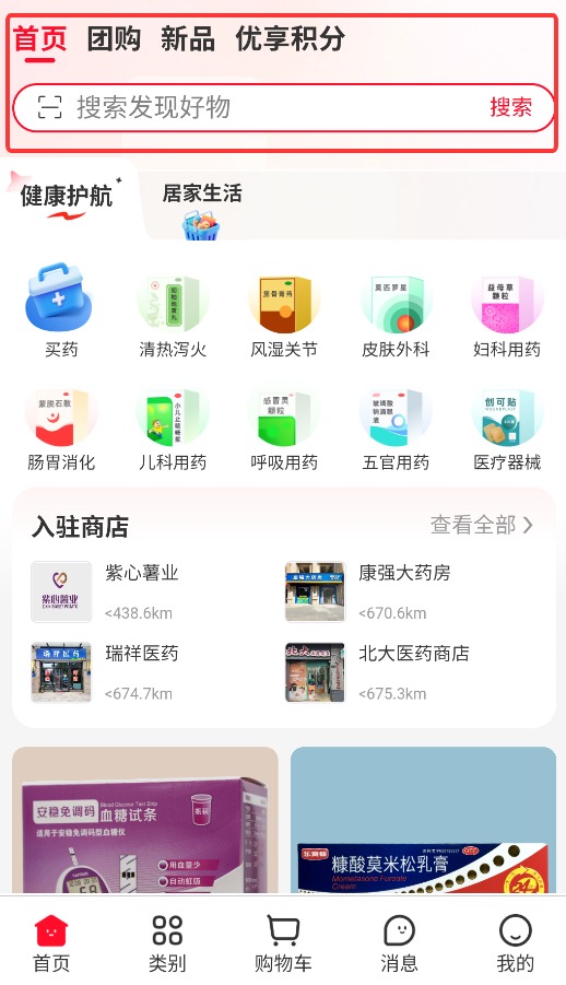 2、首页提供团购活动、新品推荐及积分兑换入口,支持关键词搜索商品。