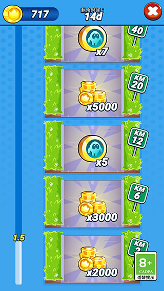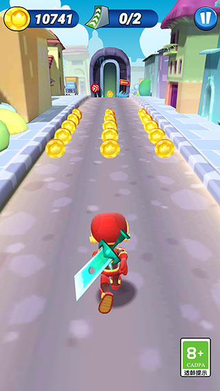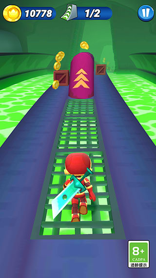 2、运用丰富强化道具助力:提供火箭、弹跳靴、磁铁、双倍金币等多种实用强化道具,这些道具能在奔跑过程中提供关键帮助。只需操控角色跑向这些道具即可完成收集,收集道具的同时还能额外获得游戏分数加成。