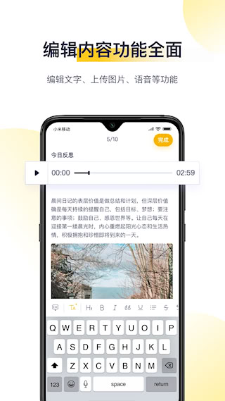 3、多媒体富文本编辑:支持在日记中不限量地插入照片和录音。同时可以设定字体样式,并插入地点、天气、步数等多种日常辅助数据,丰富记录形式。