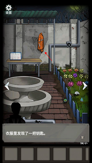 6、顺利抵达精神病院门口,却因门锁无法进入,环顾四周后,在花坛获取弹珠,到院子墙上的环卫工衣服里找到钥匙。