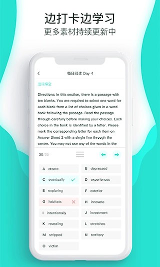 3、配套内容素材:嵌入与挑战主题匹配的学习资源,包含单词记忆、真题练习等内容,且会持续扩充补充相关素材。