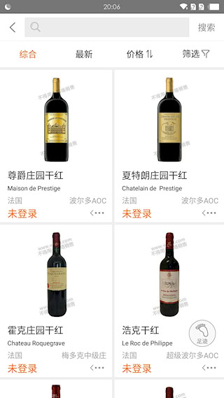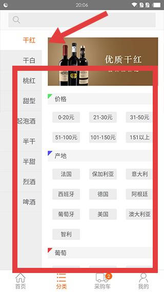 2、分类页对葡萄酒类型进行系统划分,例如干红葡萄酒等,进入后可通过价格区间、原产国家、葡萄品种等条件组合筛选,覆盖不同档次与产地商品。