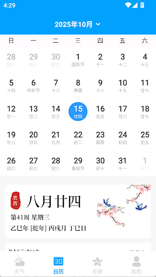 2、日历界面可以查看每个月的农历、节假日等信息