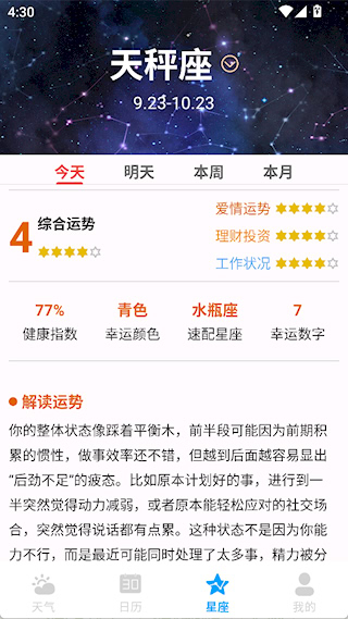 3、星座界面提供当天各个星座的运势解读