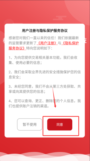 1、首次启动系统时需要仔细阅读并确认用户服务协议与隐私政策相关内容,点击同意按钮后即可完成注册进入主界面。