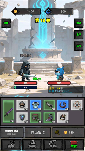 2.在战斗界面,角色会自动进行战斗,挑战关卡怪物。战斗过程中可获取金币、经验等资源,同时积累怒气值。界面底部可查看当前装备、关卡进度,还能通过 “副本”“侍神”“矿场”“成就” 等功能按钮,管理资源、培养角色。