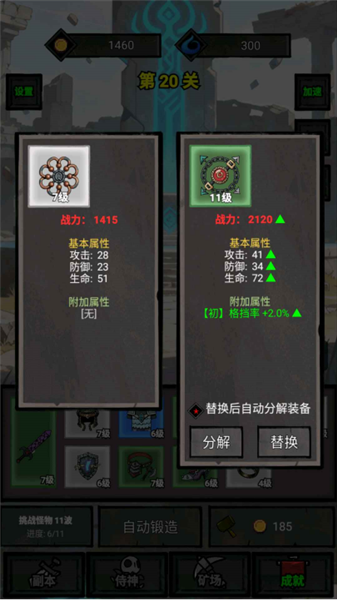 3.当获得新装备时,可查看新旧装备的战力、属性对比,选择 “替换” 按钮装备新武器,旧装备会自动分解;也可点击 “分解” 按钮,将无用装备分解为材料。