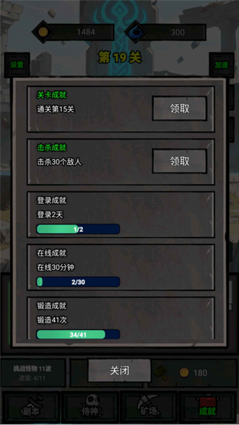 4.进入 “成就” 界面,可查看关卡成就、击杀成就、登录成就、在线成就、锻造成就等的完成进度,点击 “领取” 按钮获取对应的奖励。