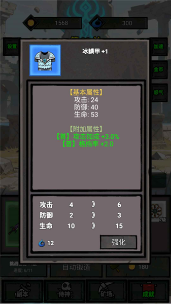 5.选择需要强化的装备,查看其基本属性和附加属性,消耗相应资源(如蓝色材料),点击 “强化” 按钮提升装备的攻击、防御、生命等属性,增强角色战力。