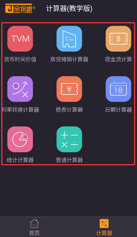 4、进入专业计算器页面后,可使用货币时间价值、房贷摊销、现金流及债券计算等工具。
