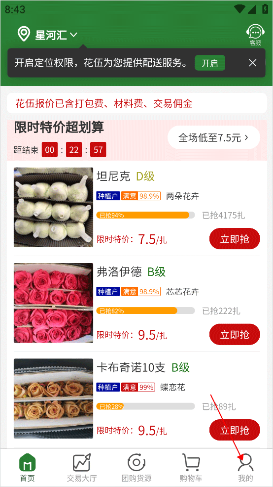 1、打开花伍鲜花 app,点击右下角【我的】选项;