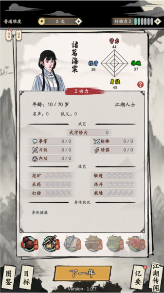 5、进入游戏如图,游戏采用文件剧情点击玩法,玩家需合理搭配每一年要做的事来提升武功。