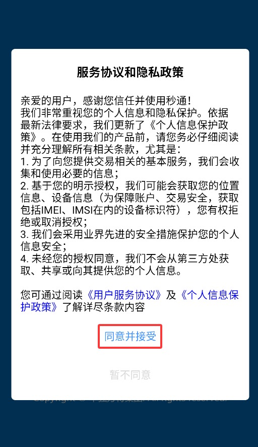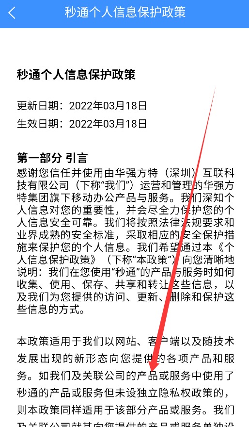 2、向下滑动页面仔细阅读并同意秒通个人信息保护政策内容。