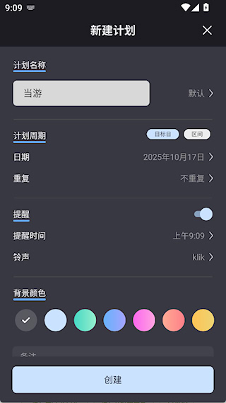 2、输入计划名称,设置时间、重复和提醒,点击创建