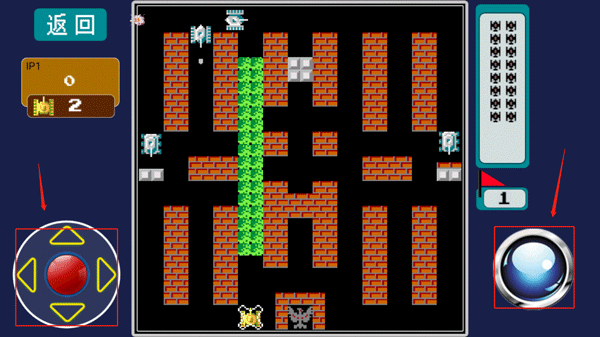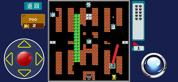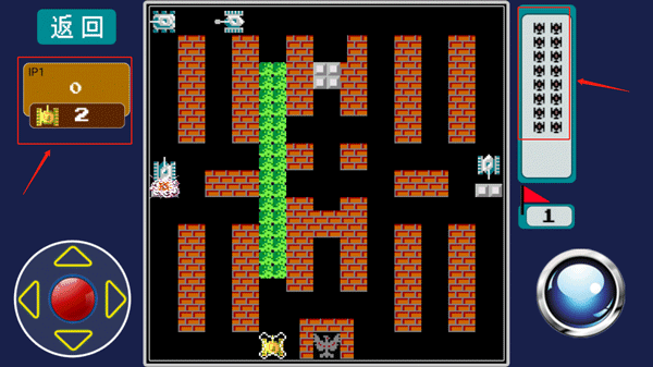 3、地图中分布着大量敌方坦克,核心目标是在保护己方 “老鹰” 基地的同时,将敌方坦克逐一消灭;双方坦克均有有限重生次数,左侧显示己方坦克生命次数,右侧白框显示敌方坦克生命次数,每击毁一辆敌方坦克,白框内数字就减少一次敌方重生机会。