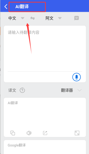 2、选择语音翻译功能可通过麦克风输入中文或阿拉伯语内容,系统将自动识别并实时转换为目标语言的文字结果。