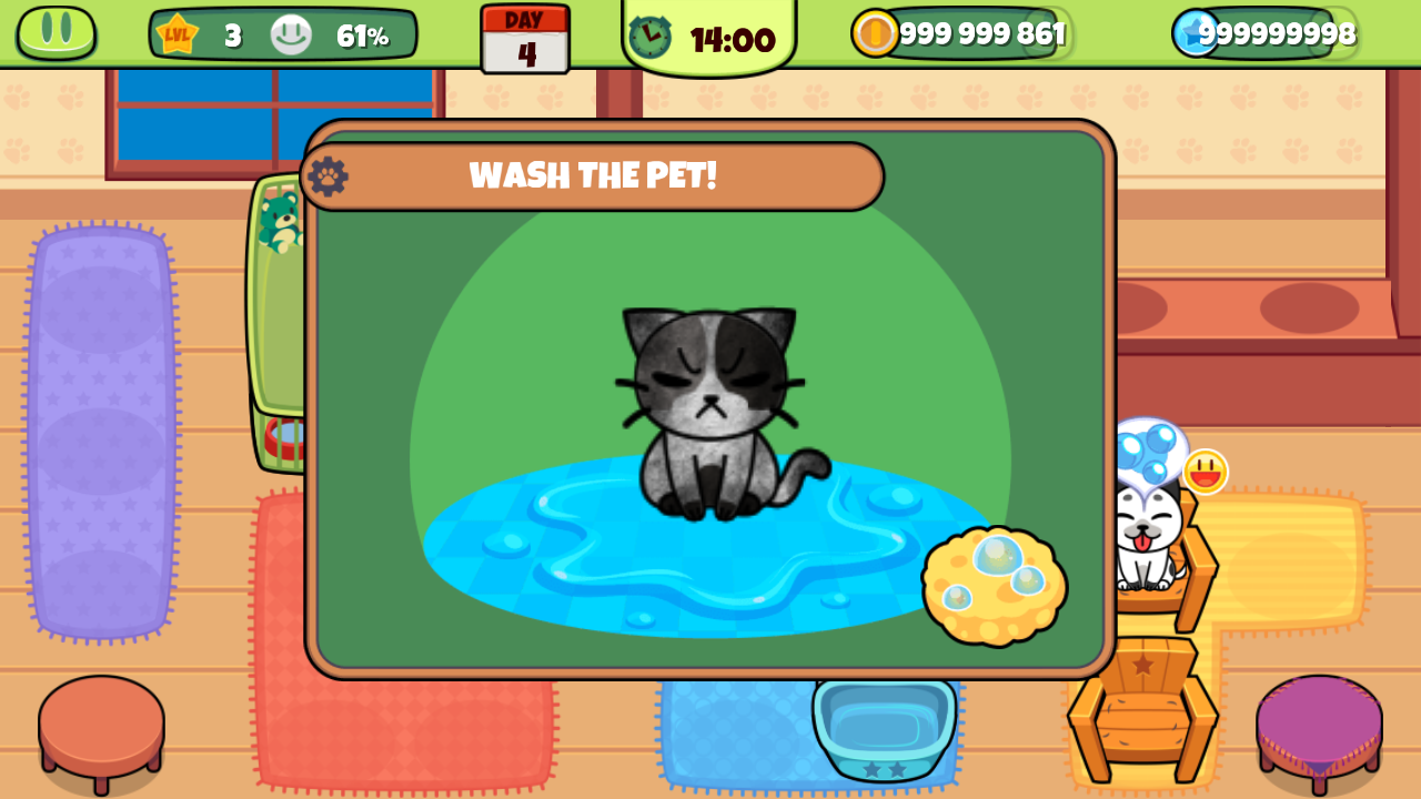 1、洗宠物:获取海绵与洗发水道具,通过操作清洁脏污的宠物,恢复其干净状态。