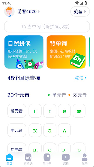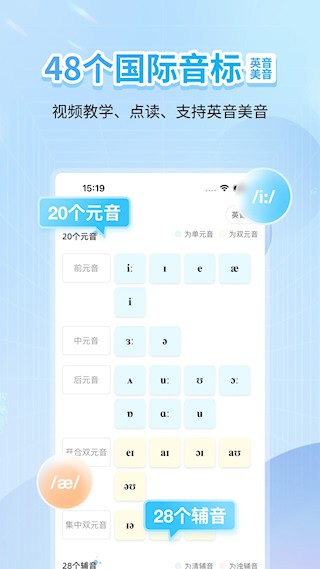1、英美音自由切换:全功能支持英音与美音双向切换,覆盖48个国际音标,配套对应发音示范,满足不同学习需求。