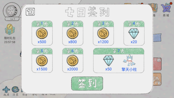 2、专业的签到功能,每日都会领取金币钻石,解锁新飞机。