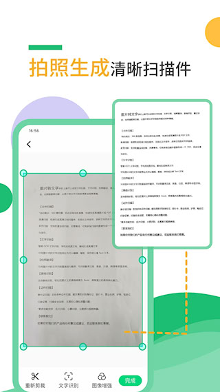 1、 通过手机拍摄文档,可智能清除杂乱背景并生成高清JPEG或PDF文件。提供多种图像增强选项,支持手动调整参数,轻松将纸质材料转为电子扫描件。