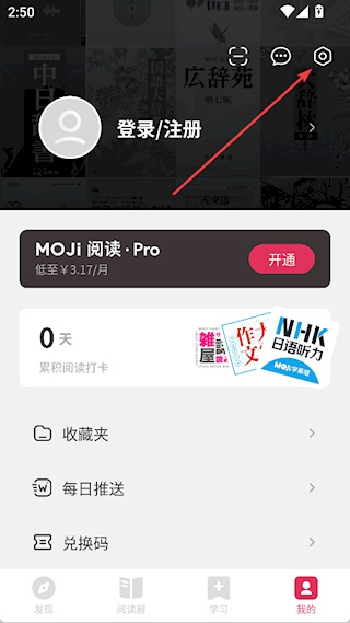 1、打开MOJi阅读app,进入【我的】界面,点击右上角螺母按钮