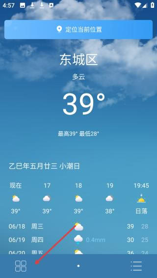 1、 进入主界面后自动定位至东城区,显示当前多云天气和39摄氏度实时温度。同时展示当日最高最低气温、近期天气预报及对应农历日期信息。
