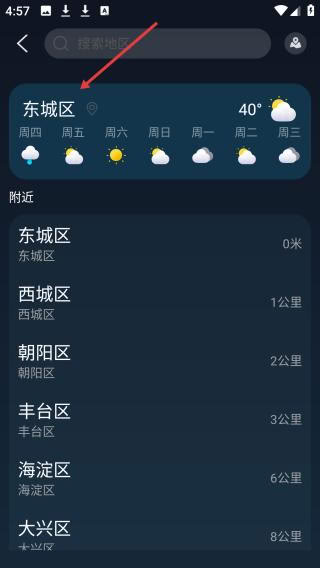 2、 在地区选择页面默认显示东城区天气,提供未来多日天气预报详情。下方列表展示周边城区名称及直线距离,方便快速切换关注区域。