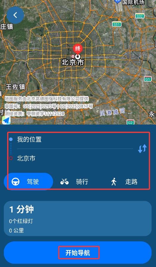 3、导航界面可输入起点与终点,选择驾驶、骑行或步行模式启动导航。