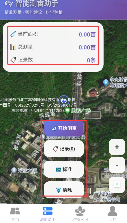 4、测亩助手提供测量启动、数据记录、标准对照及历史清除等全流程工具。