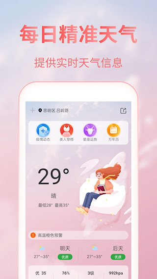 3、根据实时气象条件给出个性化的穿衣搭配推荐,兼顾舒适度与得体性,服务于日常着装。