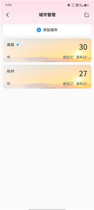 5、美人天气支持多城市天气管理,可同时关注多个地区的天气状况。界面采用定制化的粉色系设计风格,整体视觉呈现柔和雅致。